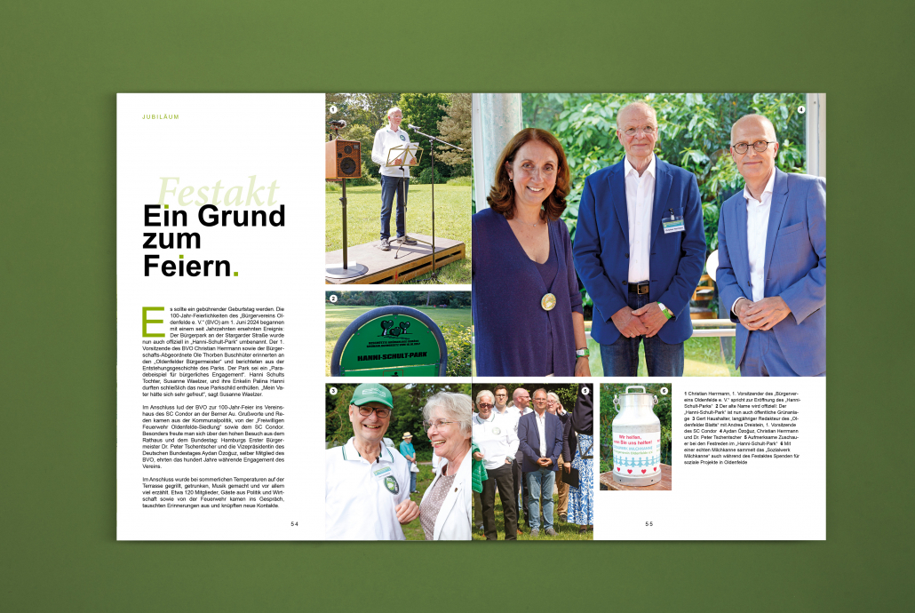 heute einer der mitgliederstärksten und engagiertesten Bürgervereine Hamburgs. Zum 100. Jubiläum entwickelten wir ein abwechslungsreiches, umfangreiches Magazin. Auf 64 Seiten geht es um die Historie und Errungenschaften des Vereins, aber auch um Wissenswertes rund um das einmalige Quartier und seine engagierten Bewohner*innen.